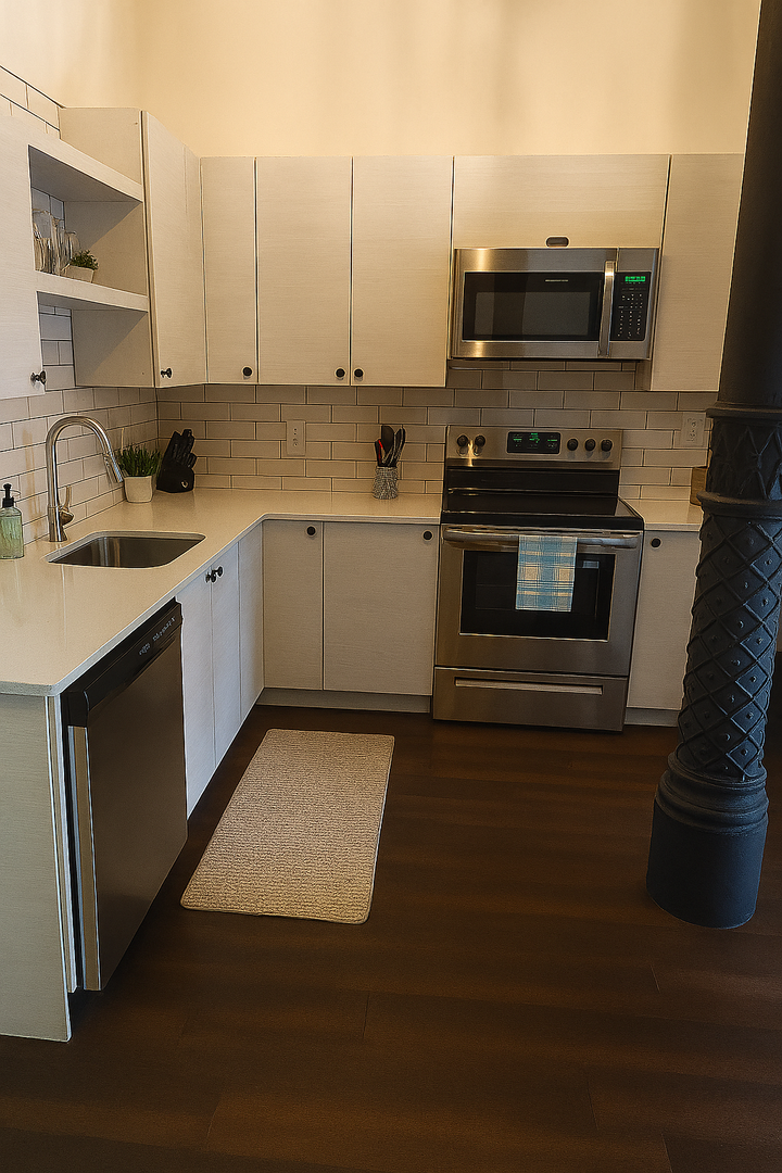 Generous open kitchens feature stainless steel appliances, glass top stoves, ample cabinet space, floating shelves, quartz countertops, and all appliances. History is reimagined with elegant Renaissance light fixtures, classic tile designs in the bathroom, and beautiful glass-enclosed showers. Strategically placed walls and custom shelving provide the flexibility to accommodate a loft connoisseur’s need for palatial openness while meeting the practical functionality of separate spaces and privacy.