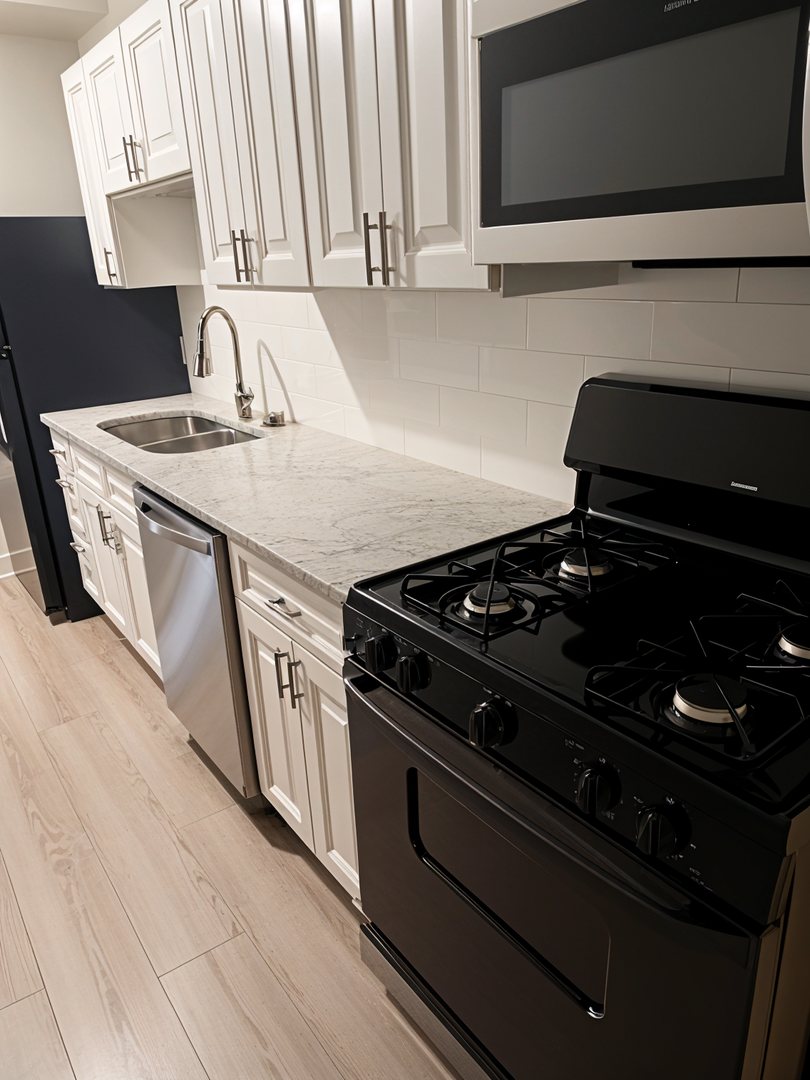 The living room is bright and spacious, perfect for relaxing or entertaining guests. The modern kitchen is a chef's delight, featuring stainless steel appliances, a gas stove, and a stylish subway tile backsplash. Whether you're preparing a gourmet meal or a quick snack, this kitchen has everything you need.