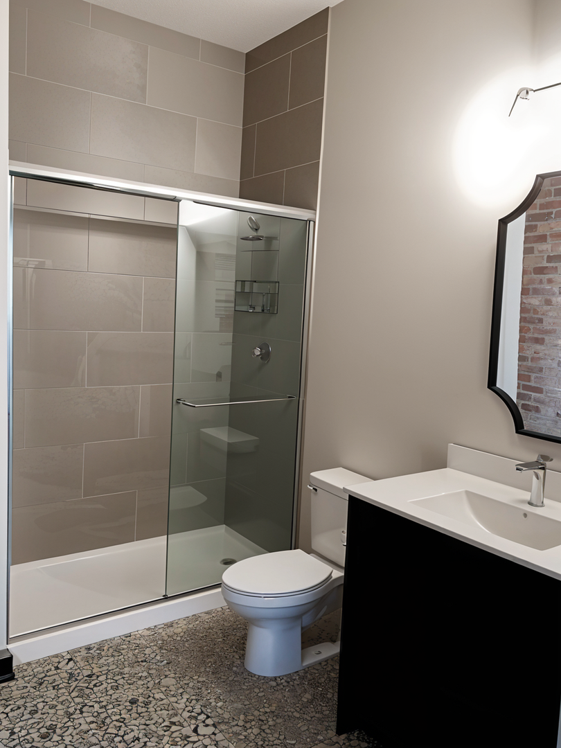 Our kitchens have everything you need, from stainless steel appliances to ample cabinet space, floating shelves, and quartz countertops. We have also added elegant Renaissance light fixtures, classic tile designs in the bathroom, and beautiful glass-enclosed showers to give the space a modern and chic look.